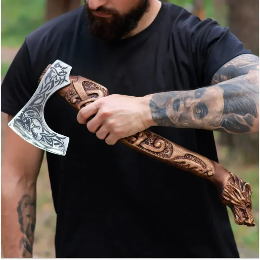 Dacă toporul are o pânză pe lamă, cred că nu zice nimeni nimic. Eu mă plimbam lejer cu bastonul de 2m având atașat un cap de greblă.
