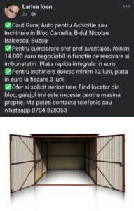2. O doamnă, locatară în cel mai mare imobil ca număr de apartamente din Buzău, blocul Camelia, a oferit pentru cumpărarea unuia dintre garajele situate la parterul blocului, modesta suma de minimum 14.000 de euroi.